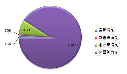 图1-1-2 2017年全省食品药品监管事业单位分布图 二、人员情况(一)行政机构人员情况截至2017年底,全省各级食品药品监管行政机构共有编制14391人,其中省级编制138人,副省级编制105,市州级编制1071人,县区级编制13077人。全省实际在岗人员13130人,其中省级到岗人数128人,市州级到岗人数993人,县区级在岗人数11906人。