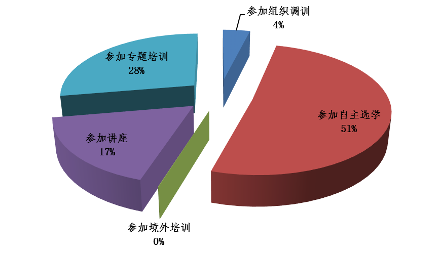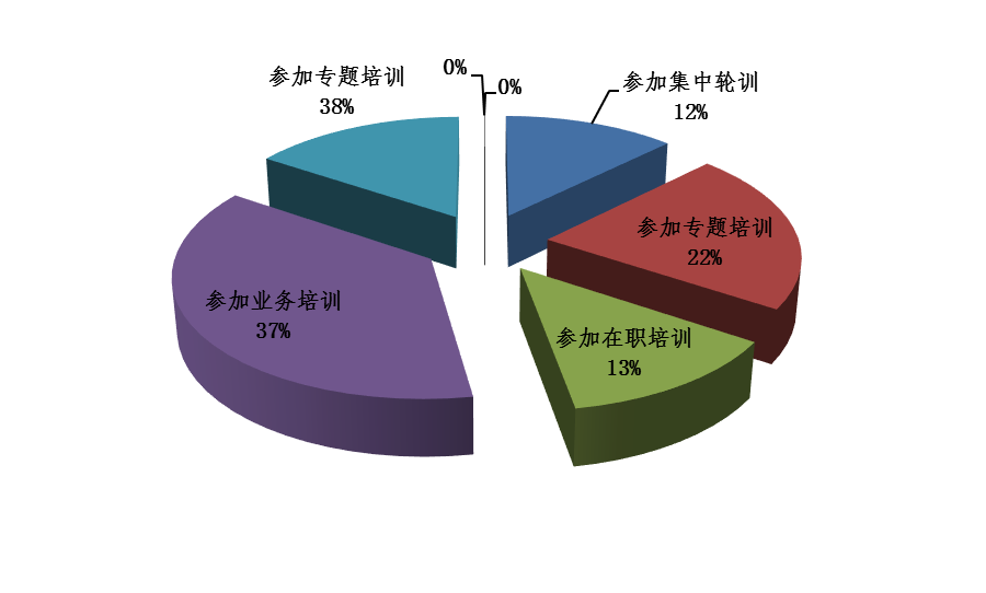 图1-3-1 2017年全省行政机构干部教育培训参训方式分布图 (二)事业单位人员培训情况2017年食品药品监管系统事业单位人员教育培训情况: 按照培训方式分为:集中轮训、专题培训、初任培训、任职培训、在职培训、专门业务培训、网络培训、境外培训等8种方式。以上8项培训合计:总人数4394人、23249人次、343808学时。 按照培训渠道分为:党校行政院校干部学院培训、系统培训机构培训、单位内部培训、高等学校培训、国家总局网络培训和社会其他培训机构培训等。